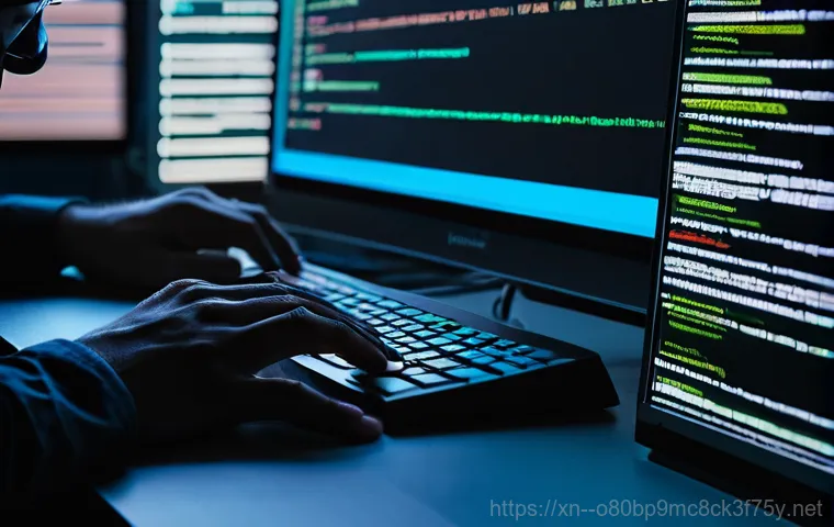 이촌동 STATUS_MODULE_NOT_FOUND - A focused shot of a developer's hands, illuminated by the glow of multiple computer screens, typing ...