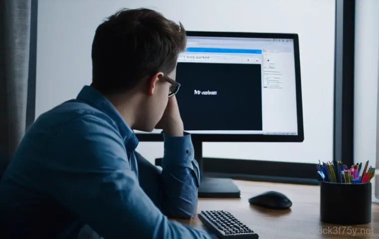 조남동 a disk read error occurred - A worried young professional or student sits in a dimly lit home office, staring at a computer monit...